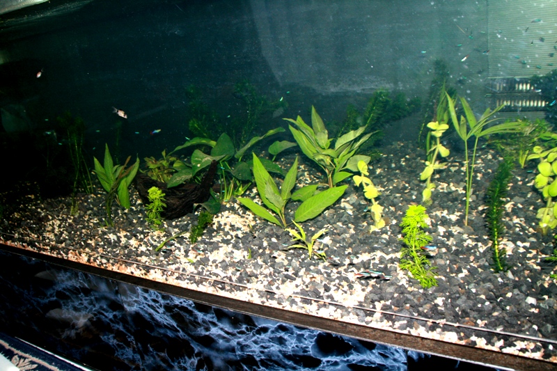 水草も水槽奥には植えずに、水槽右半分から中央付近を中心に、背に高い草を奥に適当に植えてみました♪