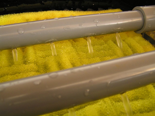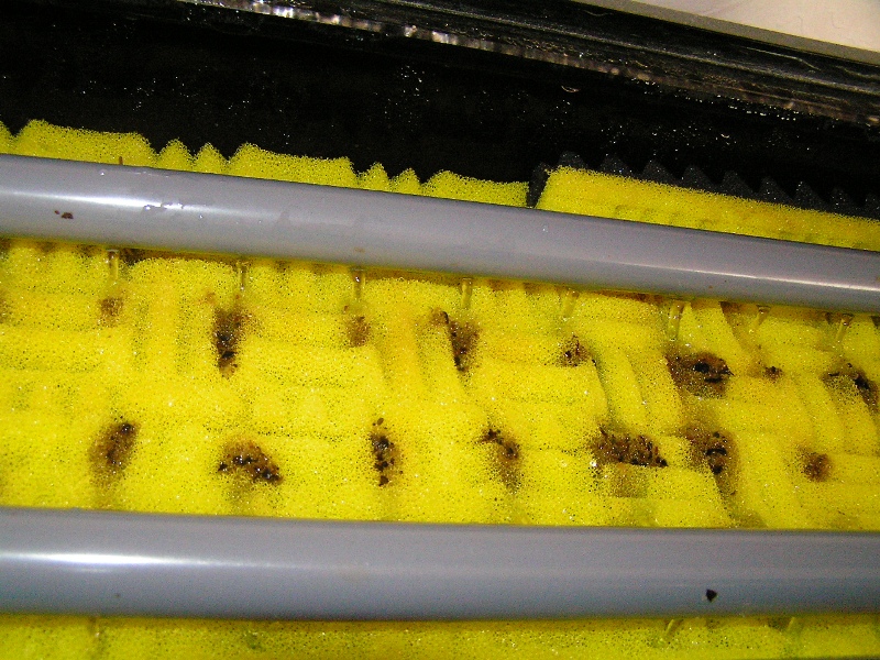この黒いスポンジを掃除するとウールマットの様な茶色の水が出てきますが、目の粗い黄色のスポンジから茶色の水はでません。