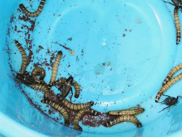 家のBaganSamakBlueは腹一杯食べてもワームやコオロギのカスを出さないのですがダスティングした場合、どれだけ直接色素や栄養素が体内に入って行ってるかはわかりません、間接的摂取のガットローディングでもワームやコオロギの体内に入る量はしれていますから、次回は振り掛け方式から塗らしたワームを粉に塗す方法で給餌してみたいと思います。