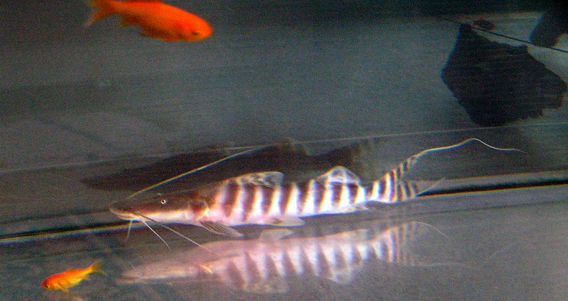 ゼブラキャットは水槽側面に沿って泳いできた小赤をパクっ!