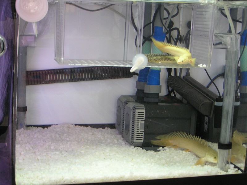 1800水槽の方は右サイドに白変個体を収容する白エリアを設けて、白砂利を敷くついでに白エリア全域をカバーする為に2個の底面フィルターを稼働させました。