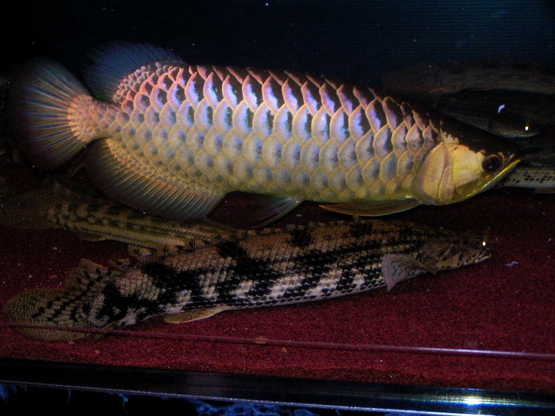 ポリプテルスの方も水槽上層をゆったり優雅に泳ぐアロワナを見て「いいな~、俺もいつか水面を優雅に泳ぎたいな~」って思ってるかもしれません!